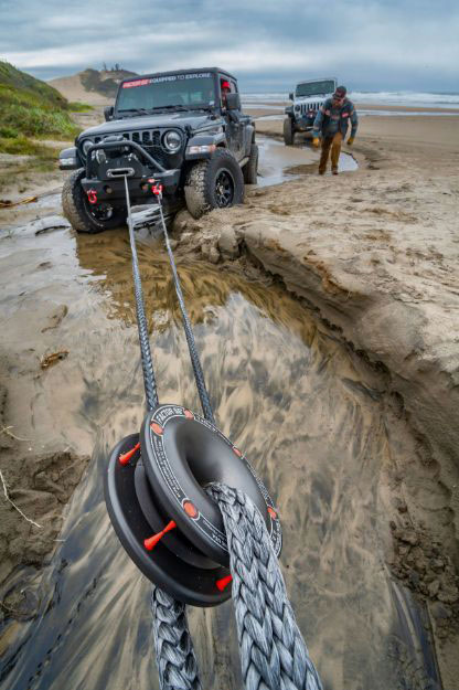 The world’s first winch friction pulley with patented rope retention feature. A lightweight alternative to traditional heavy snatch blocks/pulleys. The RRP can be used to increase pulling power or redirect the winch line. The RRP is for use with SYNTHETIC ROPE ONLY and is to be used in conjunction with a soft shackle. During momentary slack, patented rope retention rubber fingers prevent synthetic winch rope from escaping the pulley groove preventing premature rope failure. The oversized hole radius provides a smooth rubbing surface and keeps the legs of the soft shackle from rubbing on the edges of the RRP. The critical friction surface has also been TEFLON treated to increase slickness and heat dissipation.